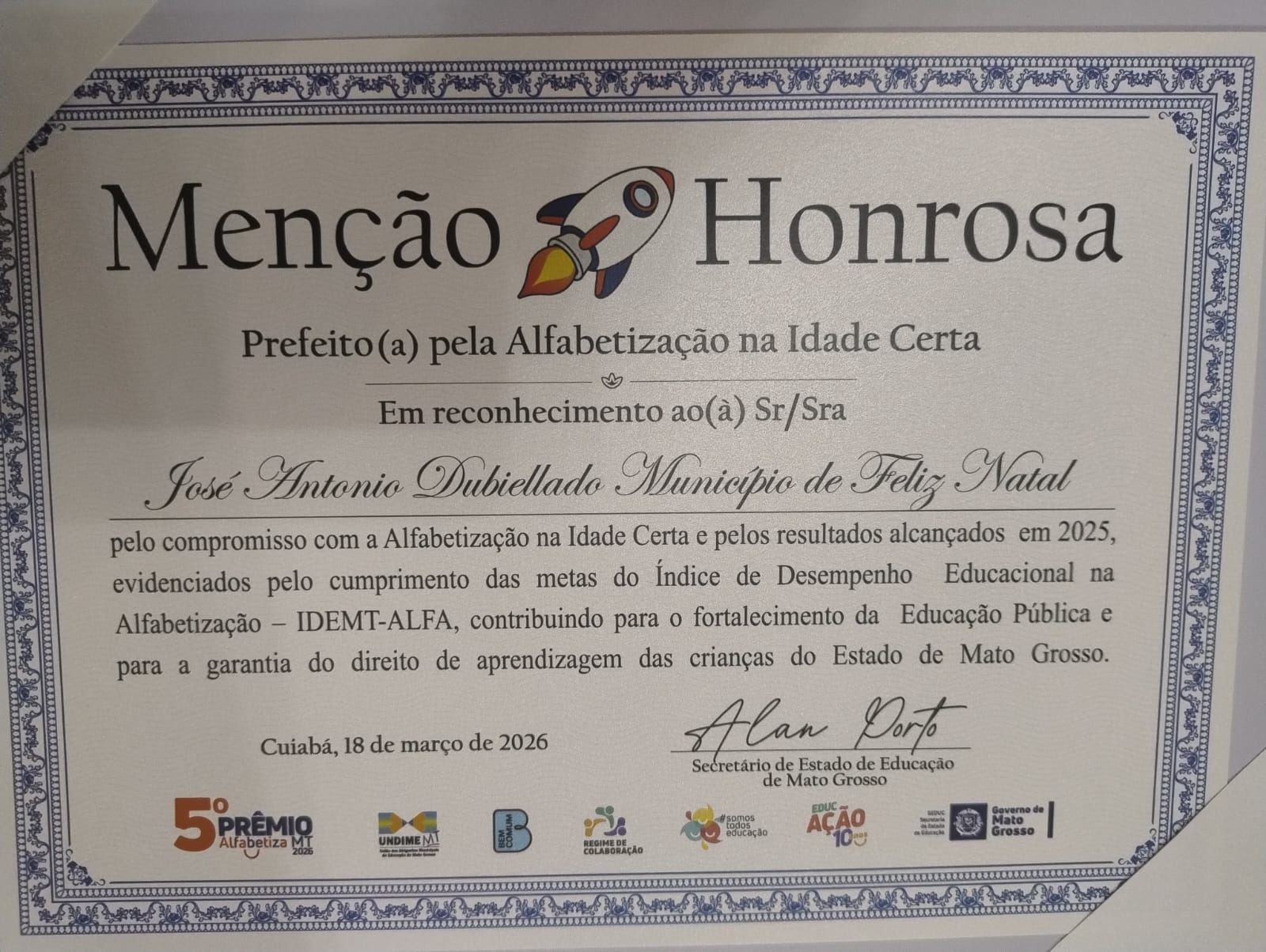 A educação de Feliz Natal vive um momento de reconhecimento e valorização. O município se destacou na 5ª edição do Prêmio Alfabetiza MT 2026, promovido pelo Governo de Mato Grosso, figurando entre os 15 melhores do estado e alcançando a 12ª colocação no ranking do IDEMT-Alfa.